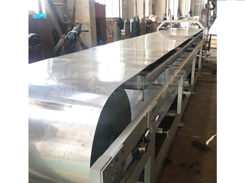 該機主要由落料模造粒成型機頭,冷卻輸送不銹鋼帶及帶輪、噴淋冷卻系統、傳動系統、保溫裝置、機架、刮刀等組成。落料模造粒機頭主要由機頭模套和機頭芯軸等組成。噴淋冷卻系統主要由噴頭、盛水池等組成。傳動系統主要由減速箱(減速器)調速電機等組成。