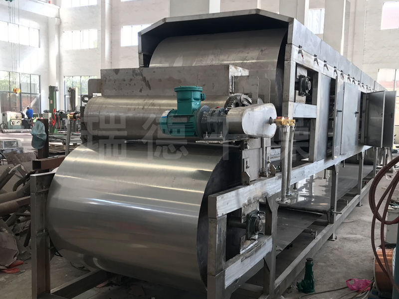 該機由液體變固體粒狀,主要是通過造粒模頭造粒,采用回轉式鋼帶連續進行,通過噴淋水冷卻定型。